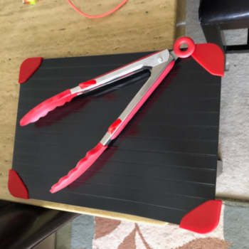 Simple design yet promising results. It won’t defrost frozen food instantly, but it sure defrosts evenly in about 30 minutes depending on what type of meat and the thickness of it. It worked much faster when I use the tong to turn it over each side for about 20 minutes. I even defrost my frozen berries on this. Using this tray to defrost is much better than using microwave or cold water to thaw any frozen stuff.