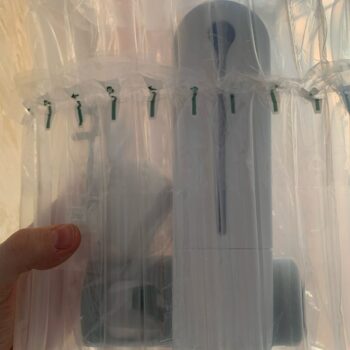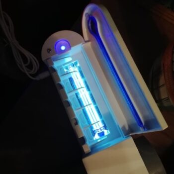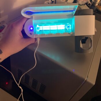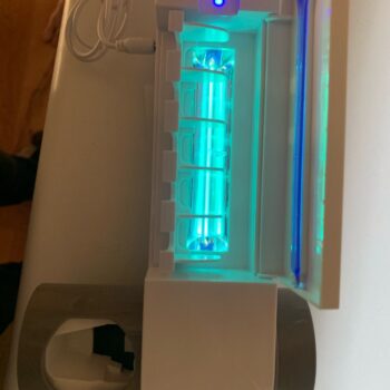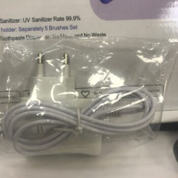 Our UV toothbrush station is built with one lithium-ion battery (included with purchase). A charger adapter comes with your order to help charge the device. The UV light fully charges in three hours, and provides 100 days’ worth of sanitization time.